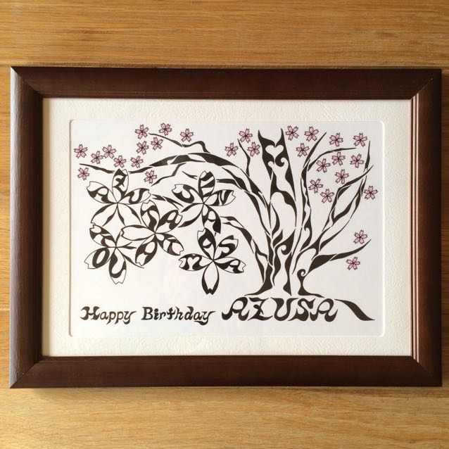 そして、花びらにご家族5人の名前を入れて欲しいとのご要望もいただき、あえて桜の木とは別に大きな桜の花を描き、隠れ文字のように花びらの中にアルファベットで名前の一部を入れました。